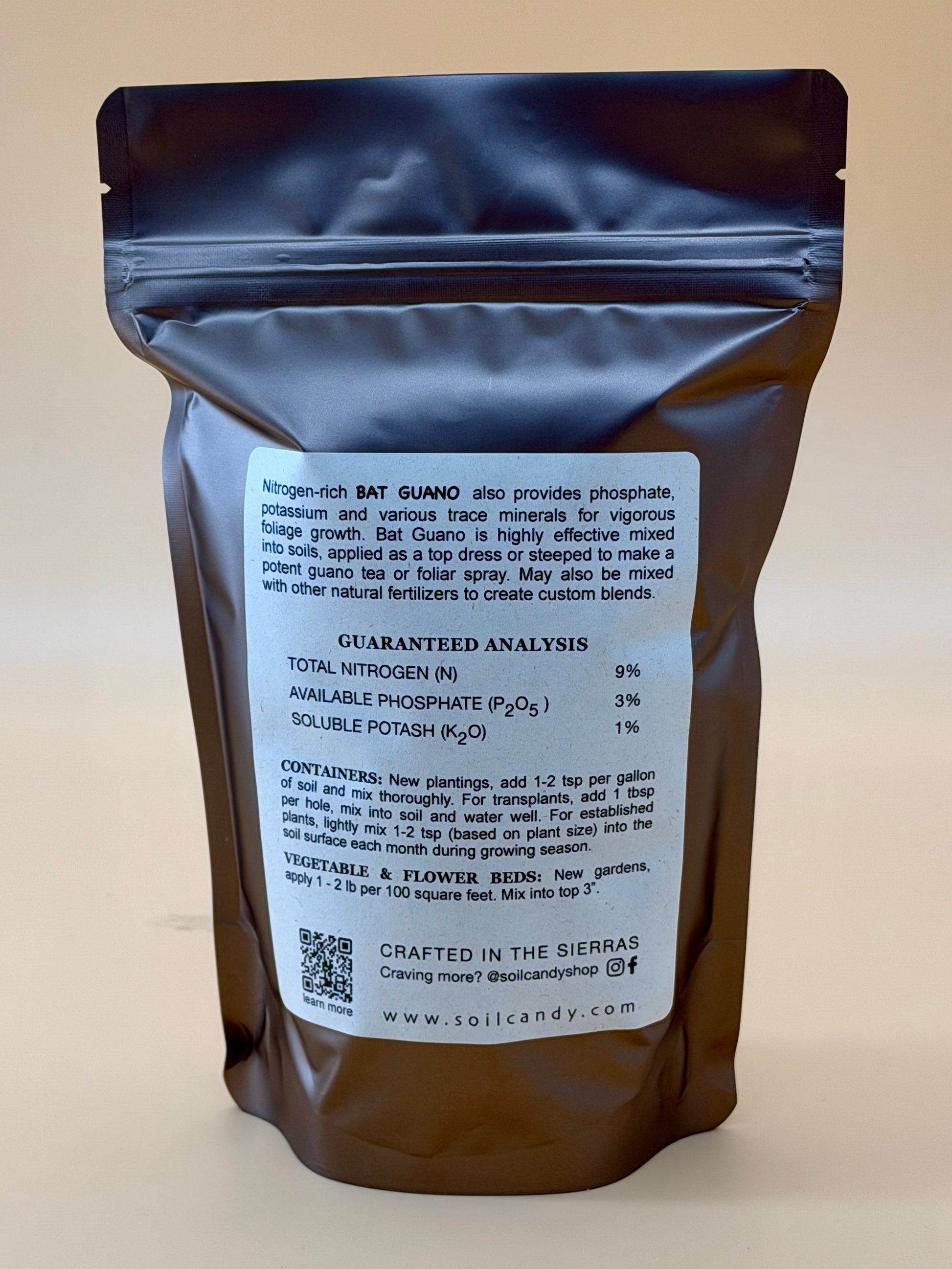 Soil Candy's BAT GUANO 9-3-1 delivers fast-release nitrogen, phosphate, potassium and trace minerals, encouraging high microbial activity. It is highly effective mixed into soils, applied as a topdress or steeped to make a potent guano tea or foliar spray. Can be combined with other natural fertilizers to formulate custom blends for specific needs.