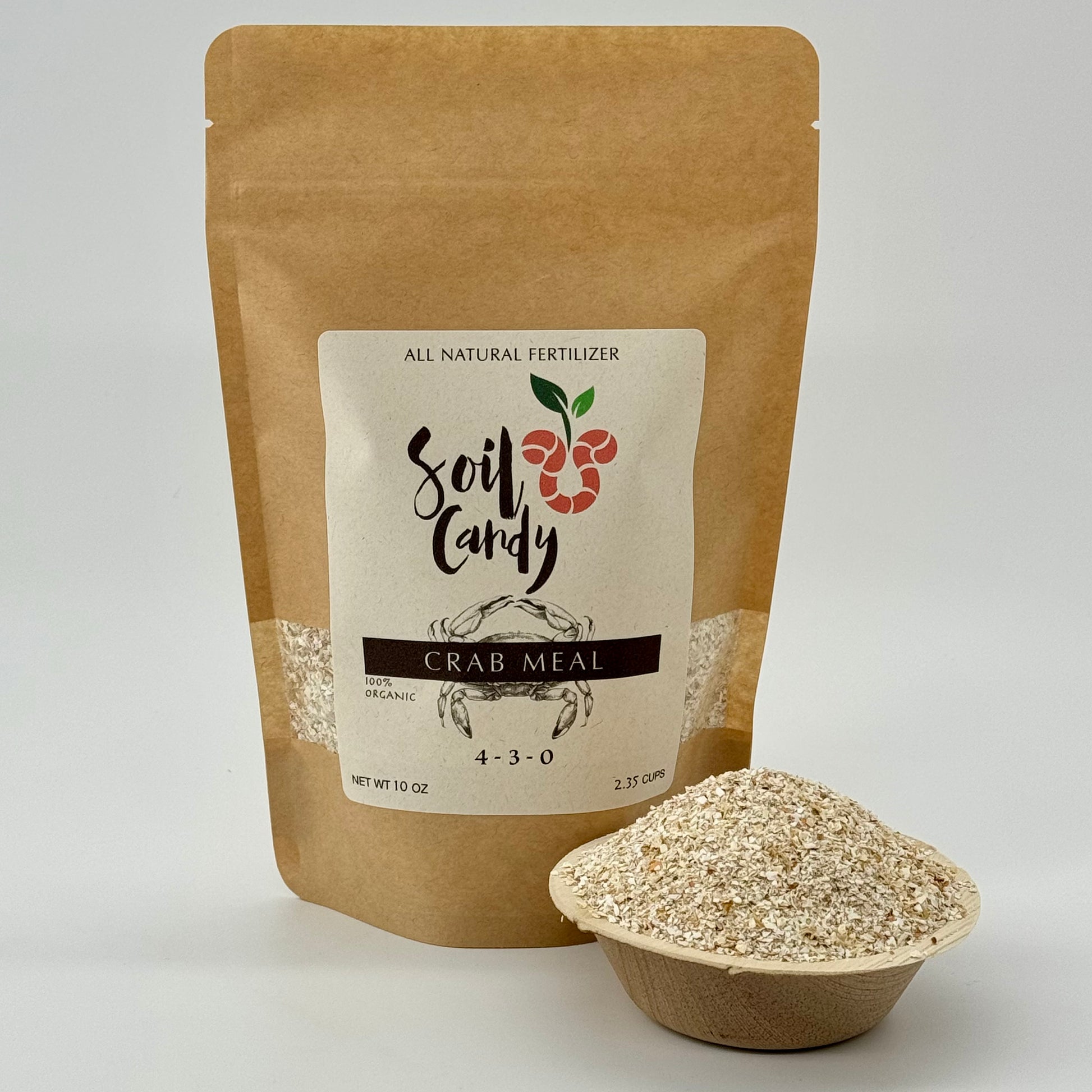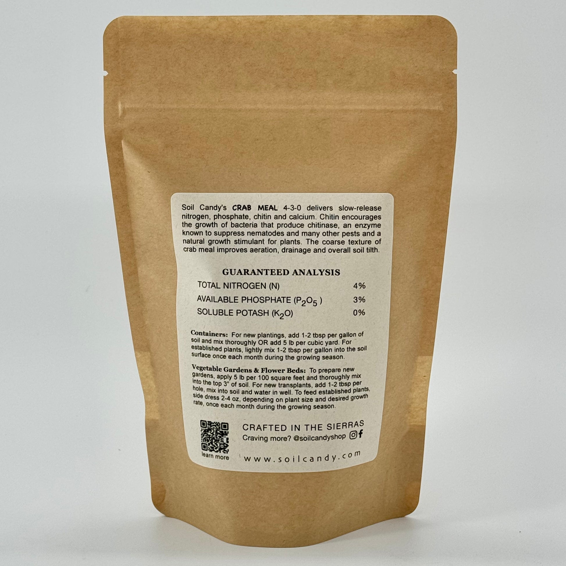 Soil Candy's CRAB MEAL 4-3-0 delivers slow-release nitrogen, phosphate, chitin and calcium. Chitin encourages the growth of bacteria that produce chitinase, an enzyme known to suppress nematodes and many other pests and a natural growth stimulant for plants. The coarse texture of crab meal improves soil aeration, drainage and overall soil tilth.