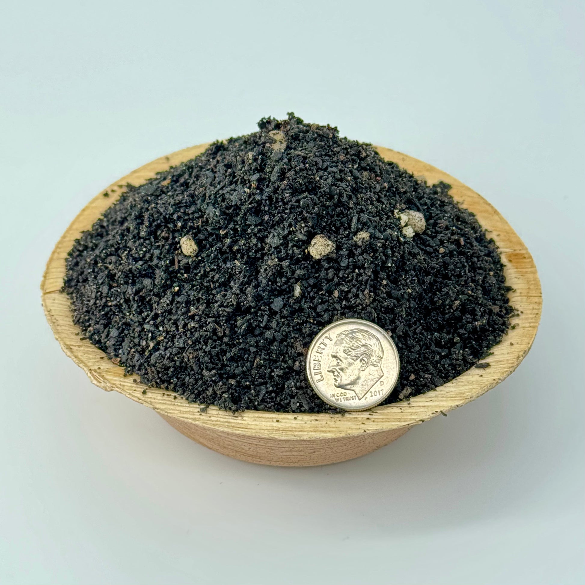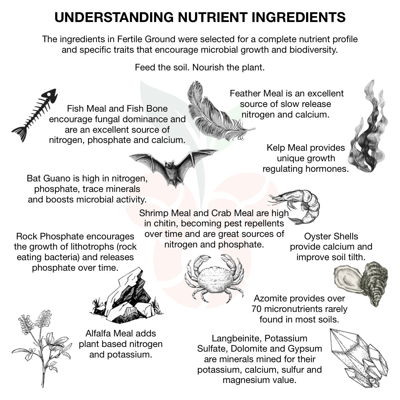 Worm Castings, Biochar, Fish meal, Fish Bone Meal, Bat Guano, Feather Meal, Kelp Meal, Shrimp Meal, Crab Meal, Alfalfa Meal, Langbeinite, Azomite, Humic Acids, Dolomite, Gypsum, Oyster Shell, Rock Phosphate, Mycorrhizal Fungi, Sulfate of Potash, Perlite