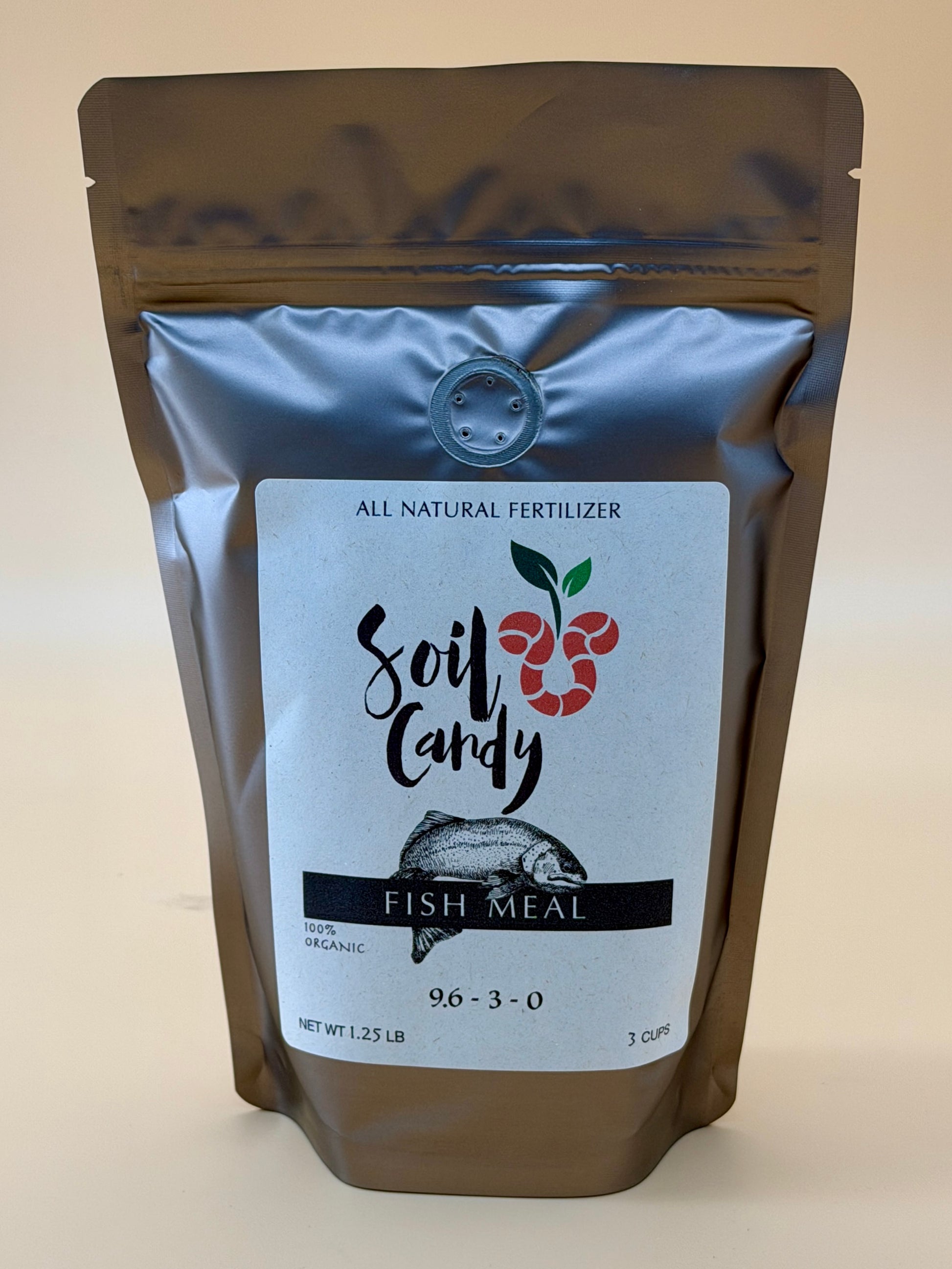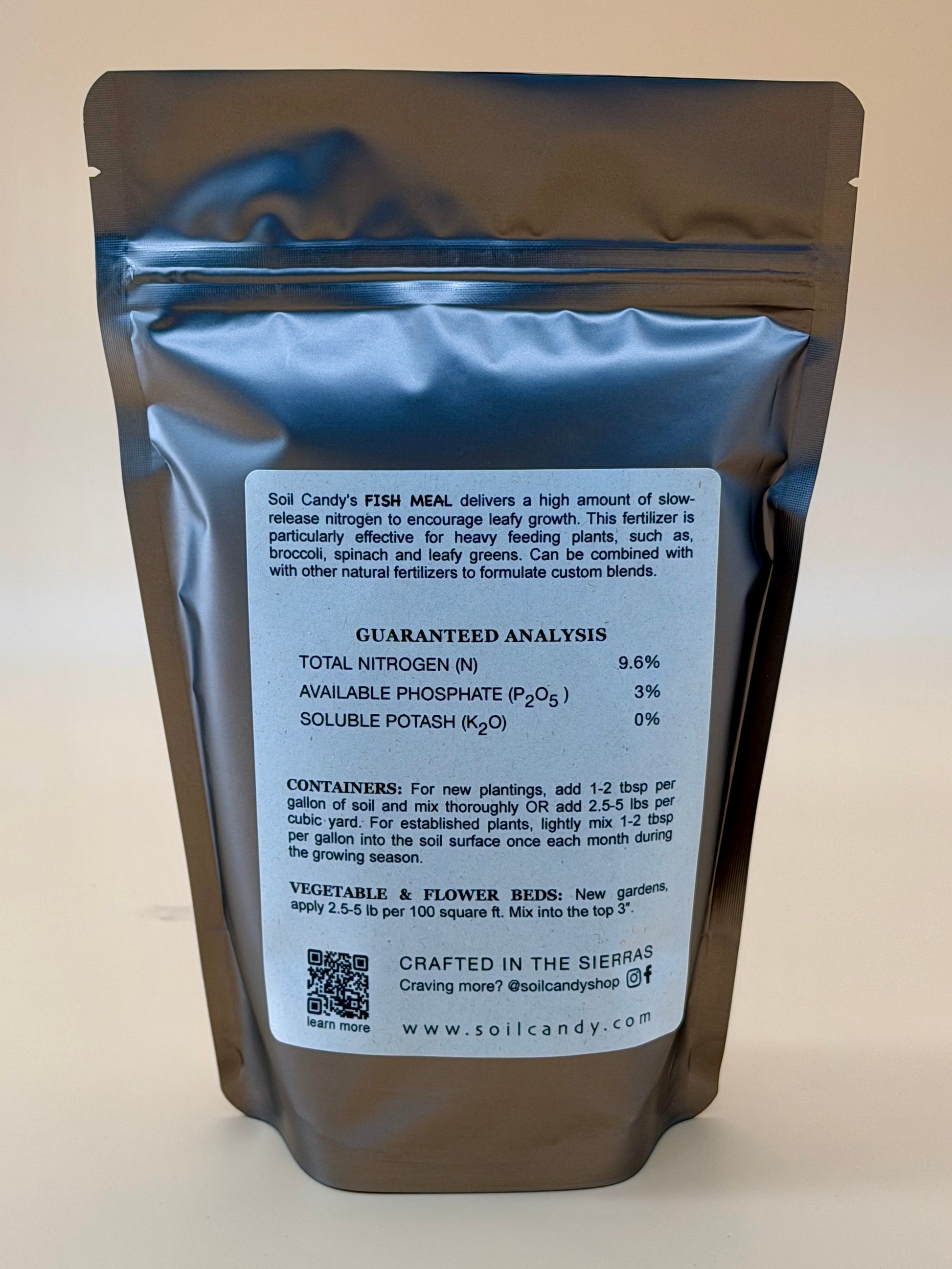 Soil Candy's FISH MEAL 9.6-3-0 delivers a high amount of slow-release nitrogen to encourage leafy growth. This fertilizer is particularly effective for heavy feeding plants, such as, broccoli, spinach and leafy greens. Can be combined with with other natural fertilizers to formulate custom blends for specific needs.
