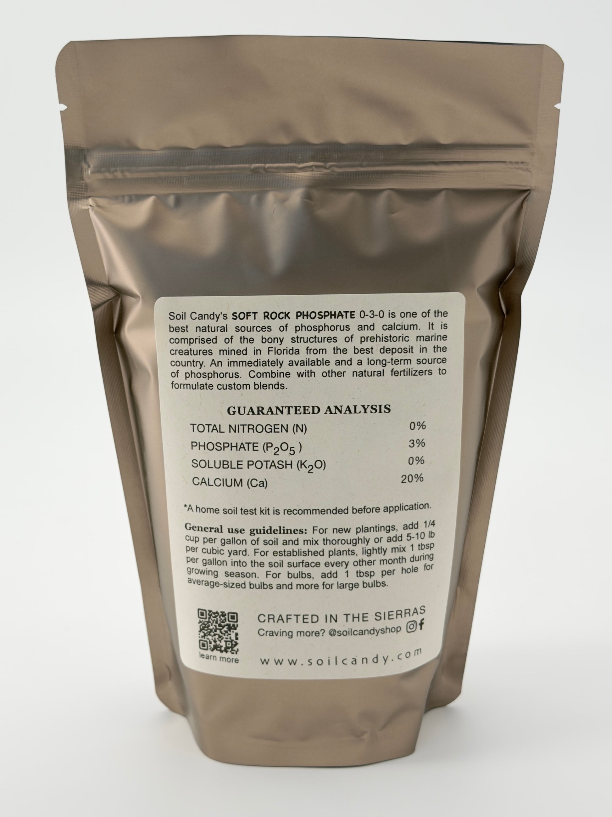 Soil Candy’s soft Rock Phosphate (Cal-Phos), also known as colloidal phosphate, is a natural untreated source of phosphorus and calcium. It is essential for building soil phosphate levels for long-term plant productivity and for preventing calcium deficient soils. It should be applied to soils prior to planting and can be mixed with compost or manures for additional soil building benefits. This premium powder grade is an excellent nutrient resource for all types of flowering plants including bulbs, fruits, shrubs, trees and vegetables.
